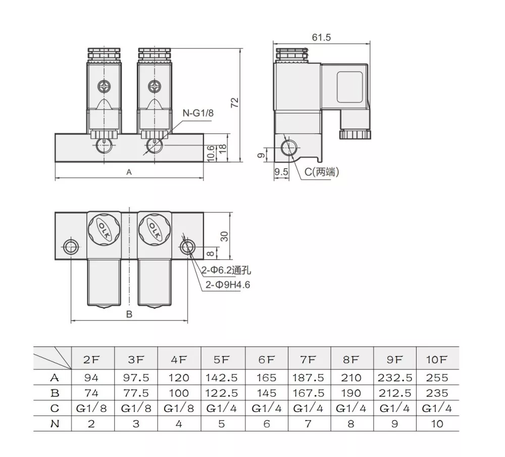 Ang 2V025 two-position, two-way direct-acting normally closed solenoid valve ay maaaring ikonekta upang bumuo ng valve base ayon sa mga kinakailangan ng aplikasyon, na may flexible expansion mula 2 hanggang 12 na posisyon. Ang multi-station na 2V025 Solenoid Valve Manifold na ito ay nagtatampok ng compact at magaan na disenyo ngunit hindi maaaring i-disassemble para sa indibidwal na paggamit. Ang valve body ay gawa sa mataas na kalidad na aluminyo na haluang metal at gumagamit ng NBR sealing material.