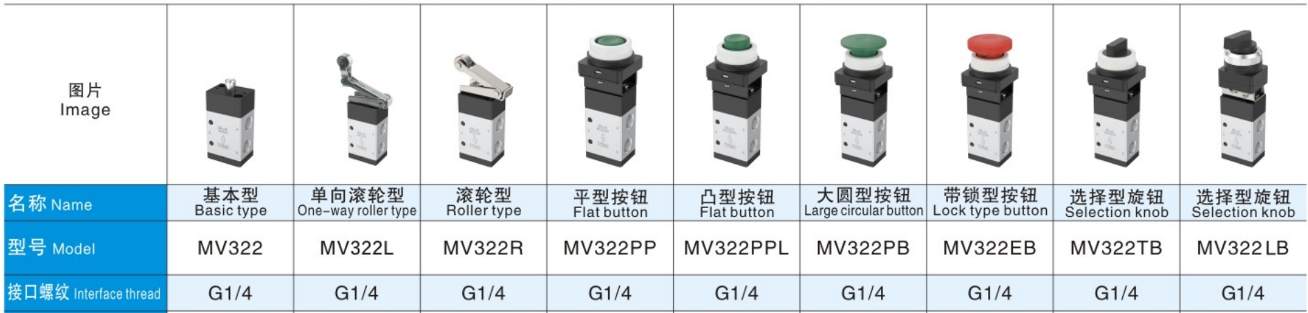 Ang MV522 Mechanical Valve ay 2 Posisyon 5 Way; MV322 Mechanical Valve ay 2 Postion 3 Way.