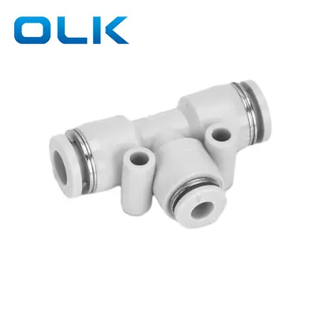 Ang PE Union tee push sa tubo na umaangkop ay isang hugis-T na angkop na ginamit upang maghiwalay o pagsamahin ang daloy ng hangin sa mga sistema ng pneumatic.