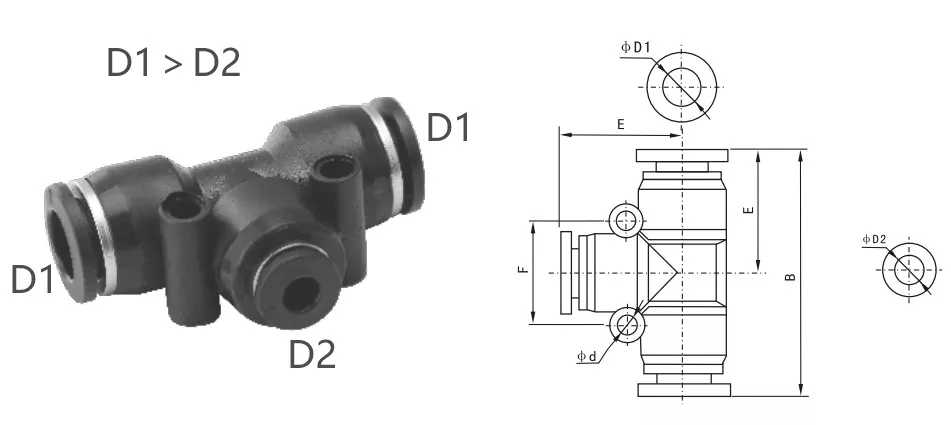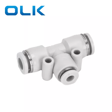 PE Fitting (Equal Tee Union): Ang lahat ng tatlong mga tubo ay may parehong panlabas na diameter, na angkop para sa pagkonekta ng tatlong pneumatic tubes ng parehong laki.