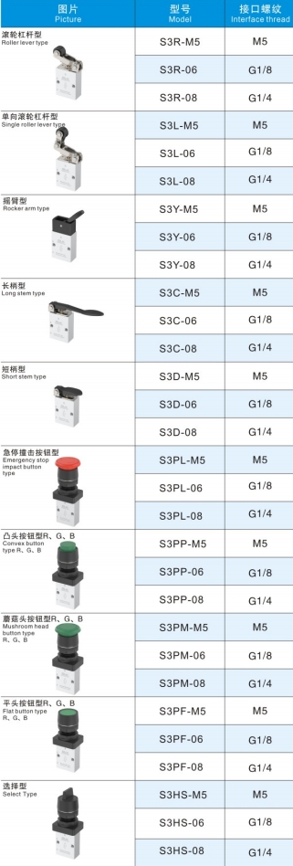 S3 Series Mechanical Button Control Valve 3 Way Pangkalahatang Mga Parameter