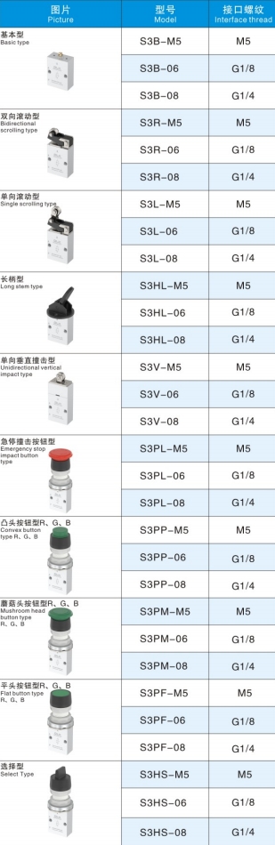 2. S3PF, S3PM, S3PP, S3PL, S3Y, S3HS, S3C, S3D Series ay manu -manong pinatatakbo, na nagtatampok ng iba't ibang mga istrukturang hugis ng mga ulo ng kontrol para sa maginhawang paggamit sa iba't ibang mga kondisyon.
